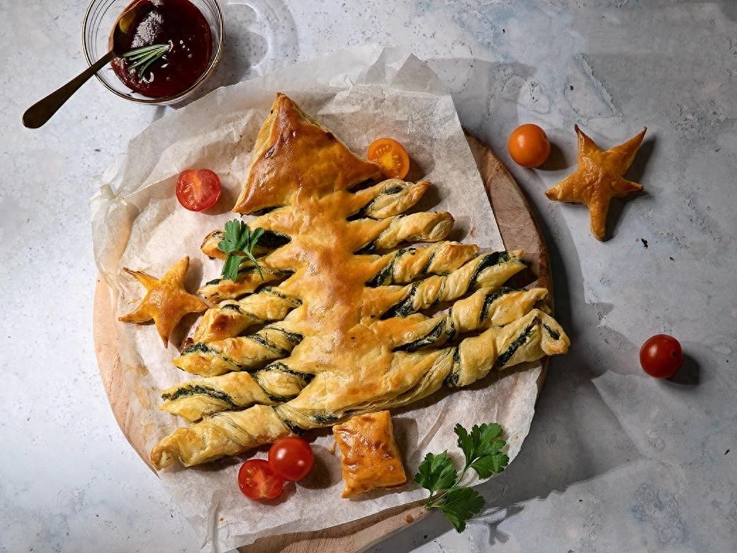 5. 蛋拂匀后加奶,扫在整棵树上,再放入烤箱烤约20分钟,或直到面团呈金黄色,吃时可佐以茄汁,并以车厘茄装饰。