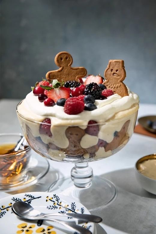 3. 预备玻璃深盘,姜饼人铺在盘边,先放水果蛋糕,放上步骤2的混合物,铺上莓果和姜饼,重复一次。