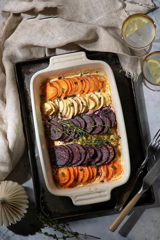 材料:紫色番薯、黄色番薯、欧洲防风草(即Parsnip)及甘笋(各1条,去皮)、忌廉(1杯)、巴马臣芝士(50克)、新鲜百里香(1大汤匙)、盐和胡椒粉(适量)