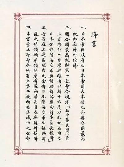 二、联合国最高统帅第一号令规定“在中华民国(东三省除外)台湾与越南北纬十六度以北地区内之日本全部陆海空军与辅助部队应向蒋委员长投降
