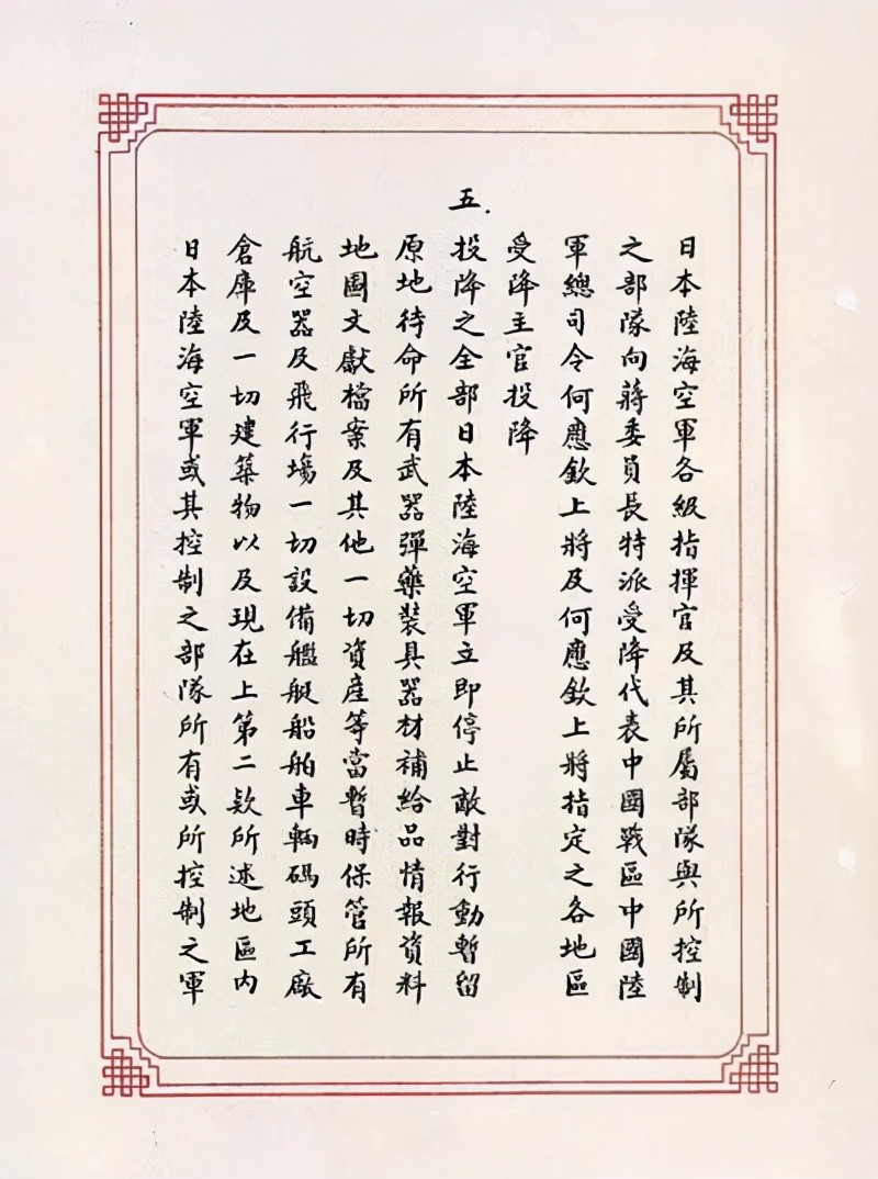 五、投降之全部日本陆海空军立即停止敌对行动暂留原地待命所有武器弹药装具器材补给品情报资料地图文献档案及其他一切资产等当暂时保管所有航空器及飞行场一切设备舰艇船舶车辆码头工厂仓库及一切建筑物以及现在(公历一九四五年)上第二款所述地区内日本陆海空军或其控制之部队所有或所控制之军用或民用财产亦均保持完整全部缴于蒋委员长及其代表何应钦上将所指定之部队长及政府机关代表接收