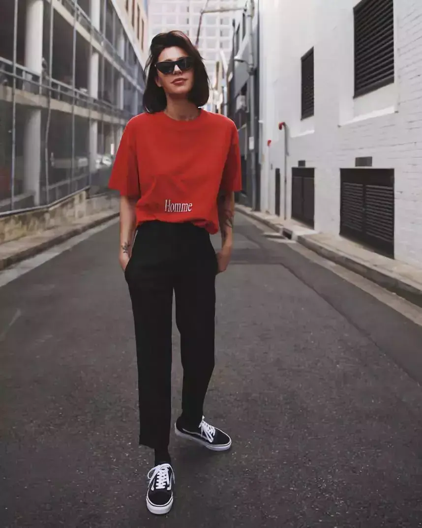用烟管裤来搭配T恤就游走于休闲与正式之间,任由场合的变化来回切换。如果说需要显瘦的话,那么一身深色搭起来就更加显瘦显高,用小白鞋来点亮一下,就更加轻盈而不压个子。