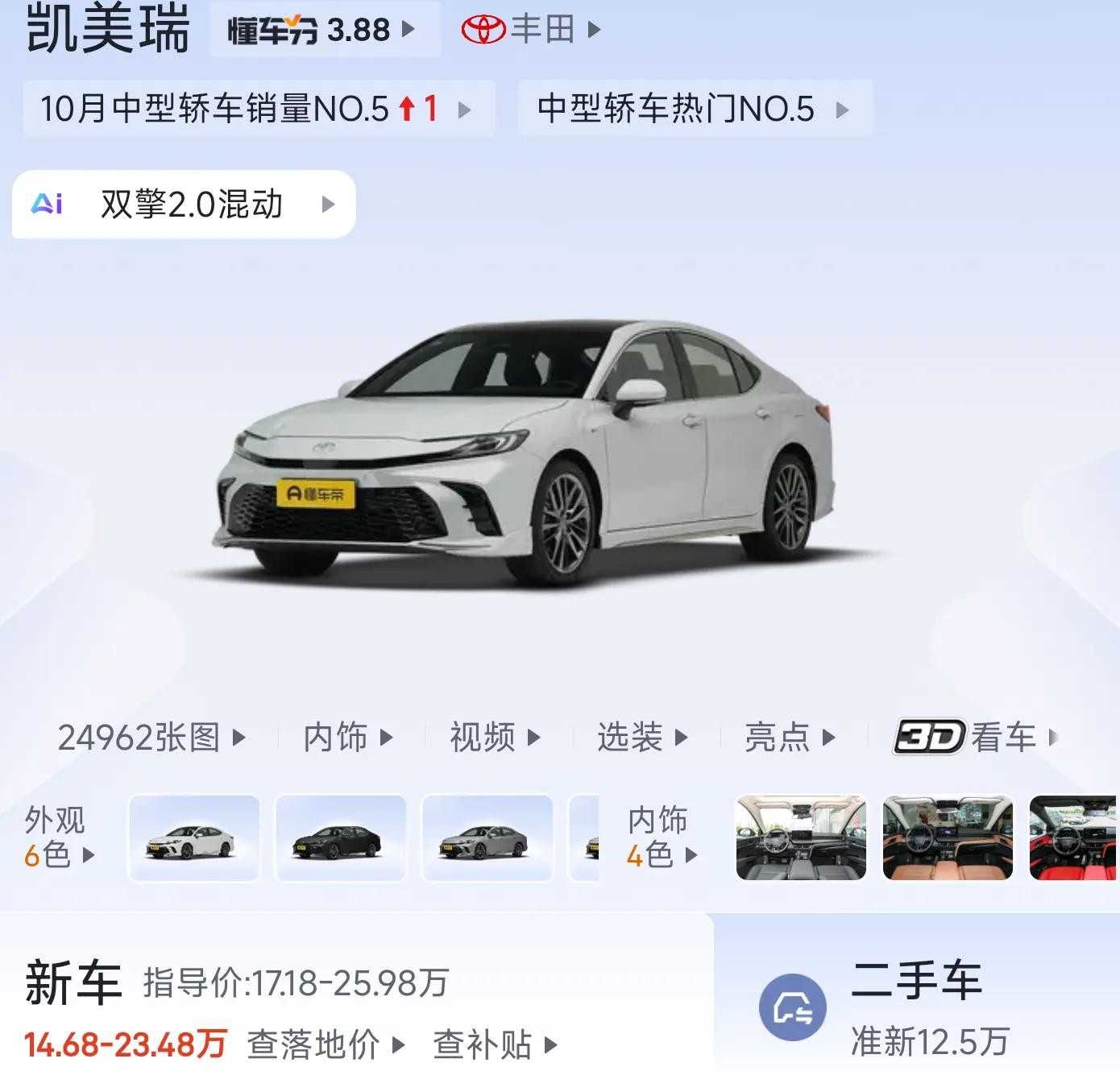 凯美瑞:指导价17.18-25.98万,优惠力度也较大,在性价比方面表现出色,特别是2.0L豪华版配置丰富,价格适中,适合预算有限的消费者。