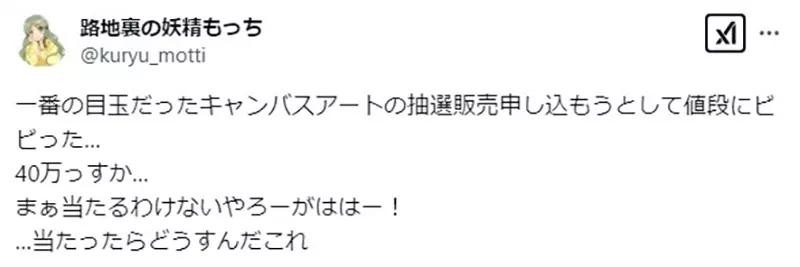 「我想说参加纪念画的抽签,但是看到价钱让我吓了一跳……40万啊……反正也不会抽中吧,哈哈哈——!……要是抽中的话怎么办啊?」(2025年1月18日发文)