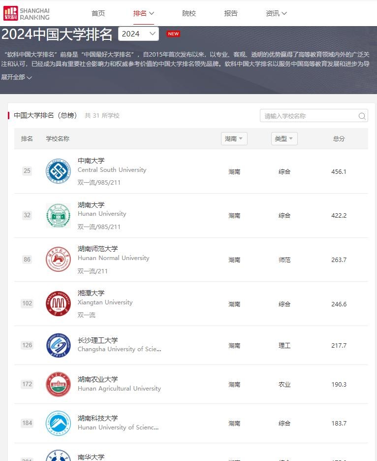 湖南高校2024全国排名,湖南大学25名,中南大学32名