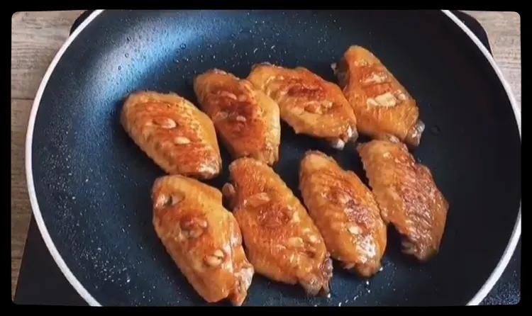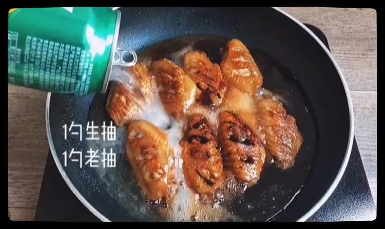 放入煮好的鸡翅,排列整齐,煎制两面焦黄后,加入灵魂雪碧。