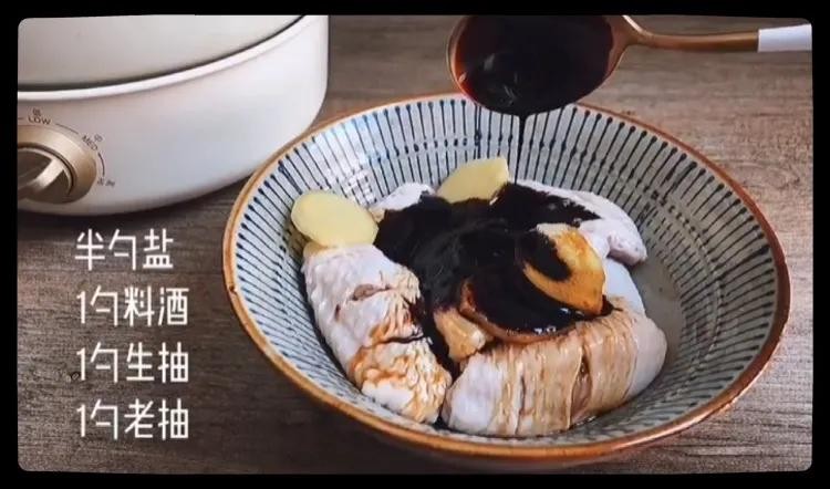 接下来在鸡翅中加入一些调料(姜片、半勺盐、1勺料酒、1勺生抽、1勺老抽),搅拌均匀,盖上保鲜膜,腌制15分钟。