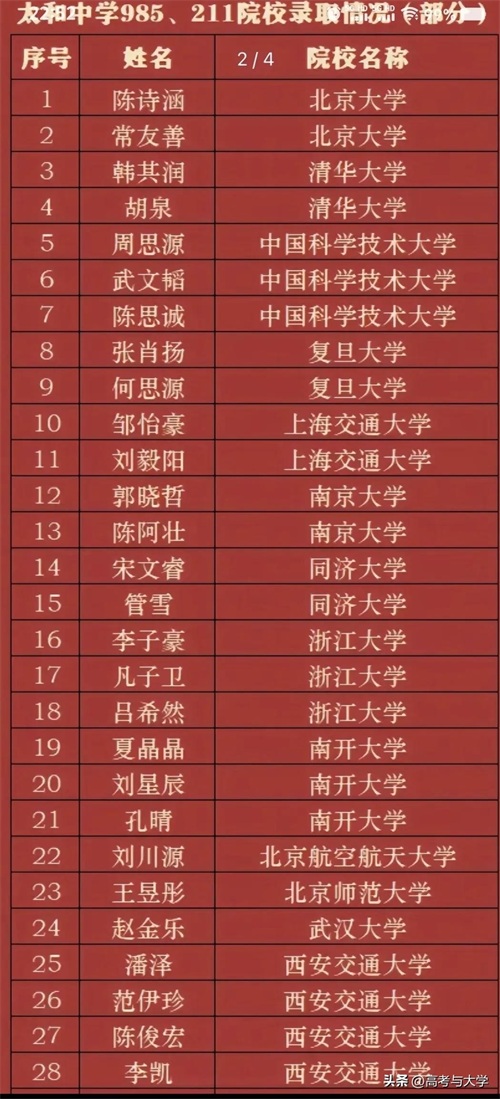 太和中学2024年高考录取985院校77人,其中清北4人,C9院校22人,211院校214人。