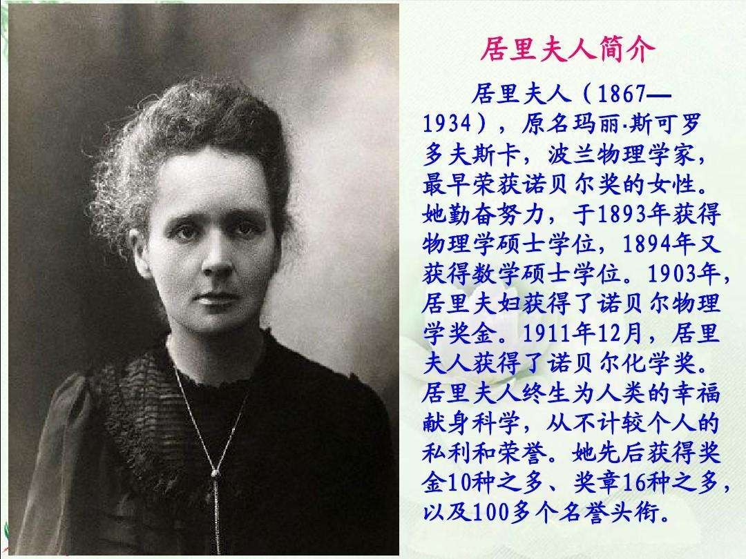 伟大的科学家居里夫人,法国籍波兰裔科学家玛丽亚·斯克沃多夫斯卡·居里(居里夫人),第一位获得诺贝尔奖的女性,第一位两次在不同领域获得诺贝尔奖的人。1903年物理学奖:发现放射性与钋元素,1911年化学奖:提炼出镭。她曾经培养出了10多位诺贝尔科学奖获得者,从某种意义上讲居里夫人的影响早已超越了科学领域,成了一种精神象征。