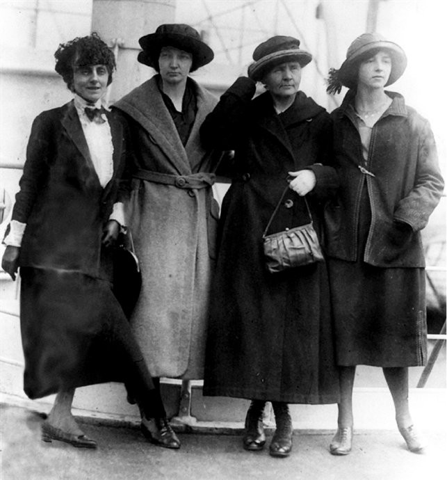 居礼夫人(右二)与伊莲(右三)、伊芙(右一)首次前往美国访问,接受赠镭仪式。右四为邀访人梅乐妮夫人