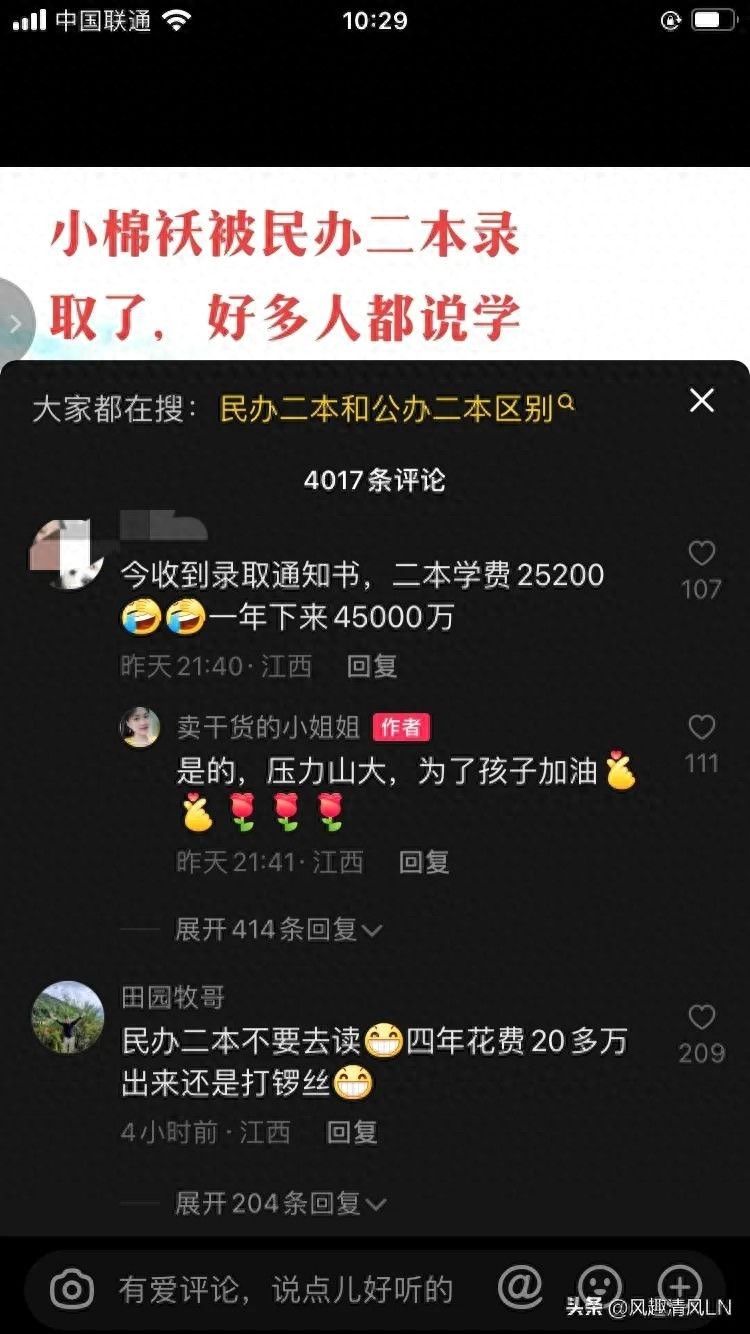 我看到别人发了自己的视频中说到“小棉袄被民办二本录取了,好多人都说学费太贵了,不如上个公办大专”。