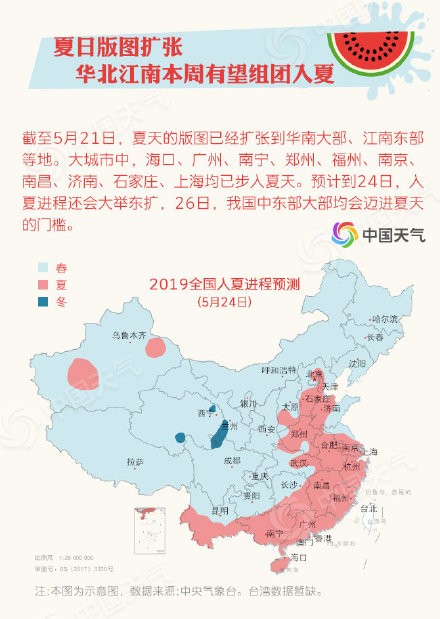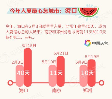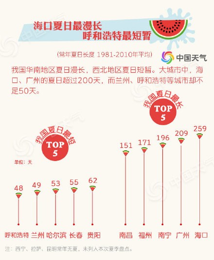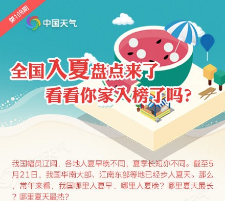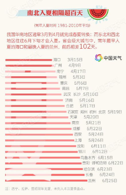 【全国入夏大盘点 看看你家上榜了吗?】截至5月21日,我国华南大部、江南东部等地已经步入夏天。那么常年来看,我国哪里入夏早,哪里入夏晚?哪里夏天最长?哪里夏天最热?夏日版图扩张 华北江南本周有望组团入夏截至5月21日,夏天的版图已经扩大到华南大部、江南东部等地。大城市中,海口、广州、南宁、郑州、福州、南京、南昌、济南、石家庄、上海均已步入夏天。预计到24日,入夏进程还会大举东扩,26日,我国中东部大部均会迈进夏天的门槛。今年入夏最心急城市:海口今年,海口在2月3日就早早入夏,比常年偏早40天,成为入夏最心急的大城市;南京和郑州分别以提前11天和10天位列第二、三名。南北入夏相隔超百天我国华南地区通常3月到4月就完成春夏转换;而东北和西北地区往往6月下旬才会入夏。省会级大城市中,常年最早入夏的海口和最晚入夏的兰州,前后相差102天。海口夏日最漫长 呼和浩特最短暂我国华南地区夏日漫长,西北地区的夏天却很短暂。大城市中,海口、广州的夏日超过200天,而兰州、呼和浩特等城市却不足50天。夏日最热“四小龙”:重庆石家庄西安郑州根据1981-2018年的气温统计,重庆、石家庄、西安、郑州凭借43℃、42.9℃、42.9℃、42.5℃的极端高温成为夏日气温最高的四个城市。