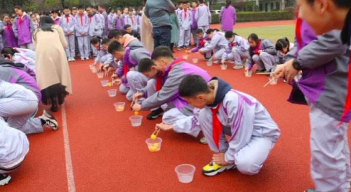 筷子夹球接力则在班级之间进行比拼,每班10个球,15人,时间最短的班级获胜。