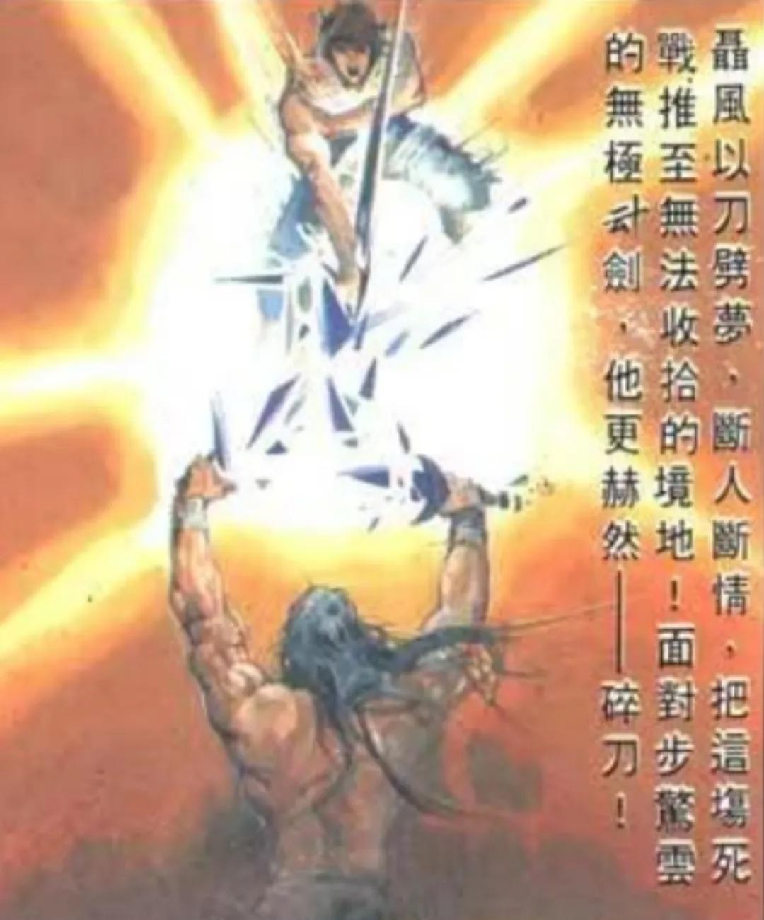 另外漫画中也有旁白对此进行了描述,聂风是为了对抗步惊云,故意碎刀,既为了对步惊云造成伤害,又为了突出聂风的决绝,我一直认为,步惊云和入魔聂风的这一战是《风云》系列最精彩的一场战斗,作者对氛围的把控真的堪称完美。