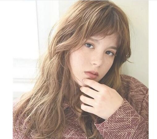 亚麻色的女生中长发发型,前面是齐刘海式的慵懒卷发发型,这样的女生卷发发型卷得轻盈又很自然,前面是好看的齐刘海式的,这样的梨花头风格的女生慵懒卷发显得唯美又自然。