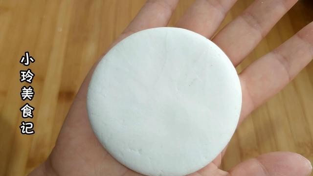 步骤二:面醒发好了,再揉一揉,取一小块面用手按成小碗的形状,放入豆沙馅收口再揉圆,轻轻的按扁,油炸糕生坯全部做好了