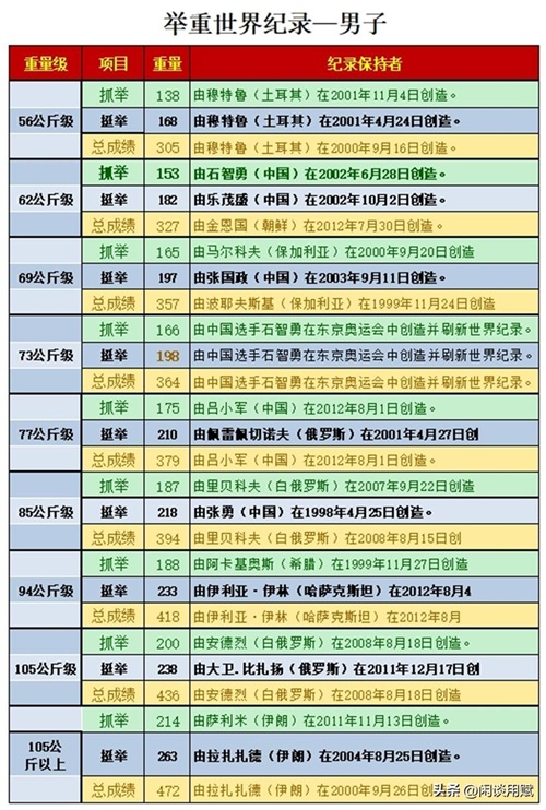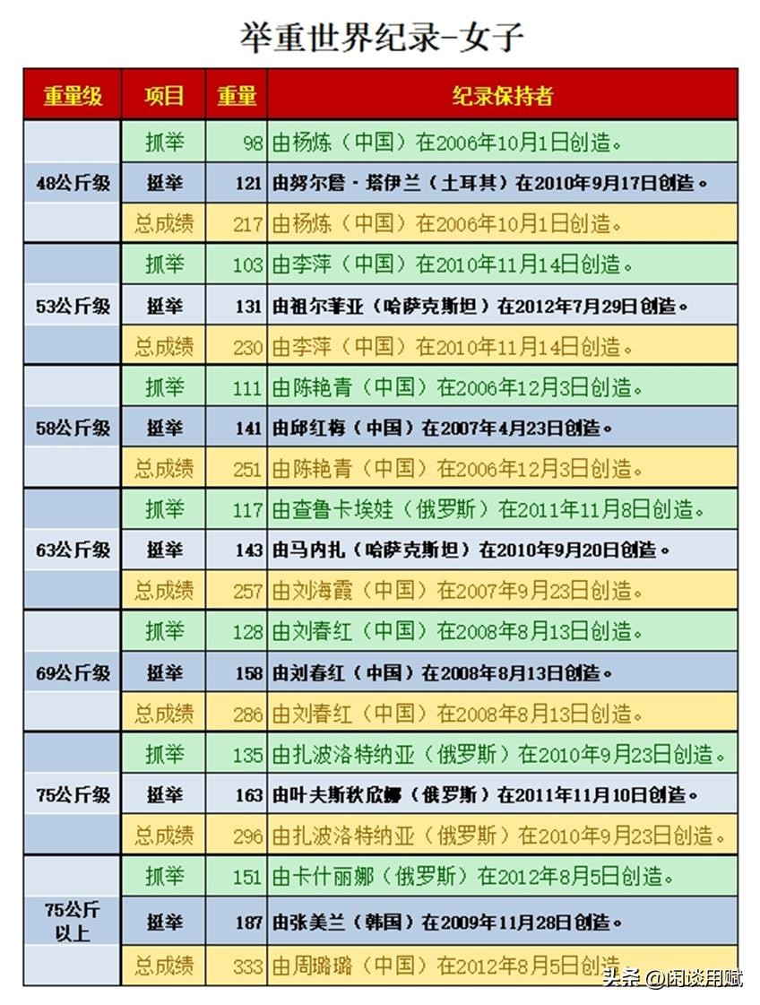 举重各个级别世界纪录多少公斤?