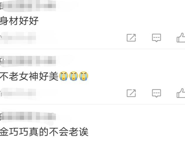 网友看到金巧巧的近照后,纷纷夸感叹道:"金巧巧真的不会老",45岁的她仍拥有细腰,网友对此夸道:"身材好好",还有网友直呼金巧巧为"不老女神",可见其状态之好。