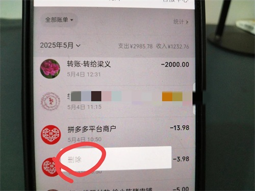 在这里,我们仍然可以看到之前已经从聊天记录和账单中删除的原始账单。这是因为这些数据会自动同步到记账本中。要彻底删除,只需点进去删除即可。(如上图所示)