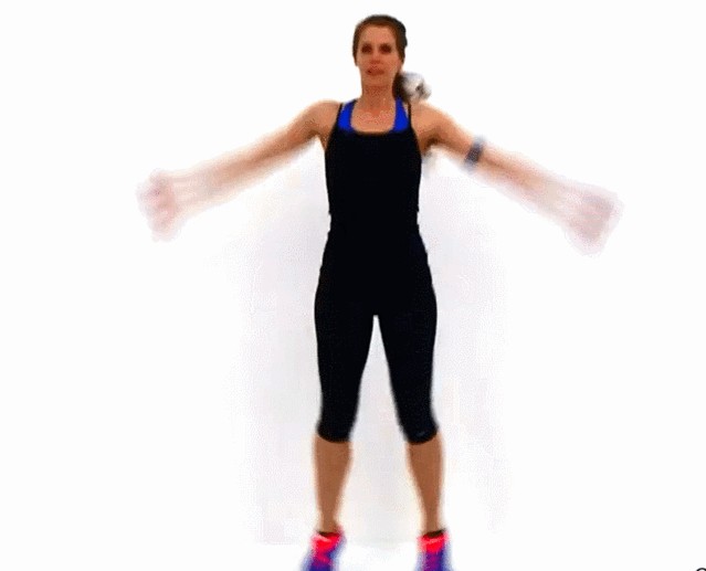 动作是先站直身体,双手放在身侧;跳起时,双脚向外,双臂高举过头;落地时,双脚合埋,双手放回两旁。可加强心跳率。