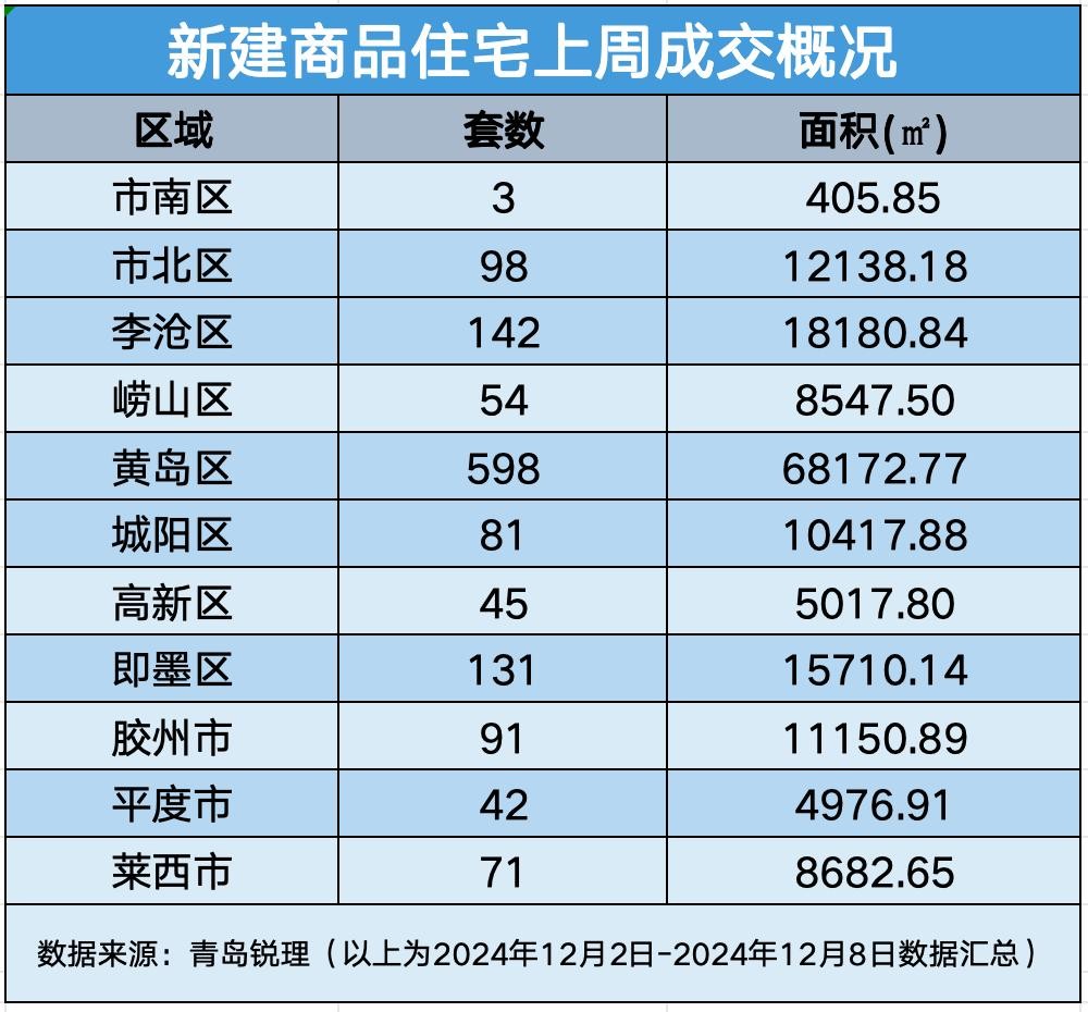 上周青岛各区市新建商品住宅成交数据统计 数据来源:青岛锐理