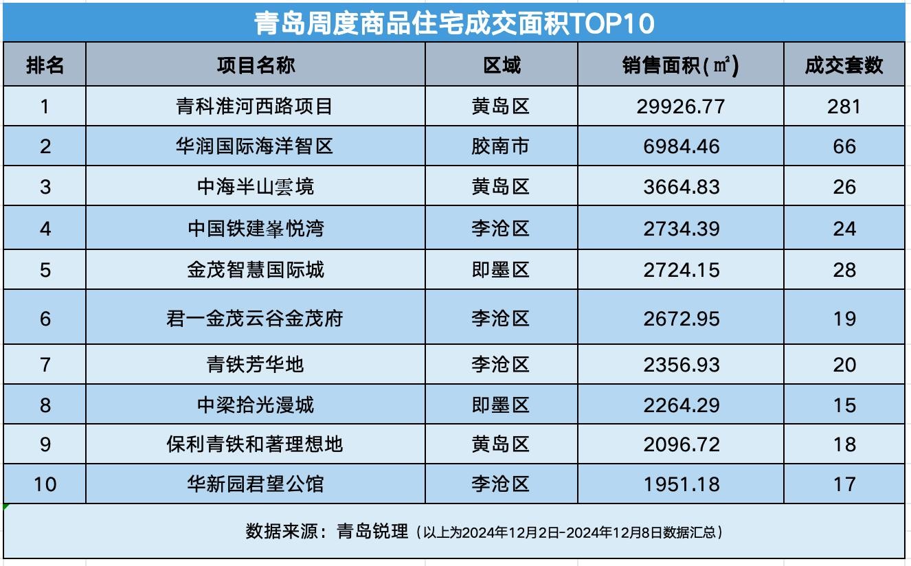 青岛周度商品住宅成交面积TOP10 数据来源:青岛锐理