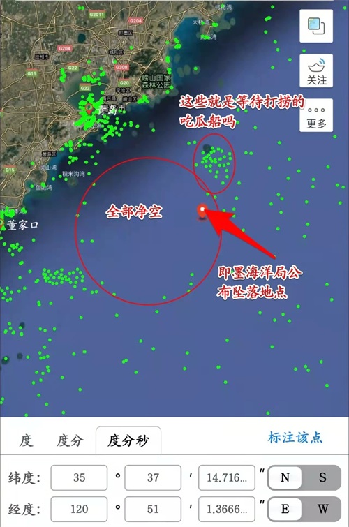 这是2023.2.13日早上7点查询山东海域船只情况,看样还没有打下来,大家都围在东京120度51分,北纬35度37分,等着快速出击,准备取证,顺便打捞上来。