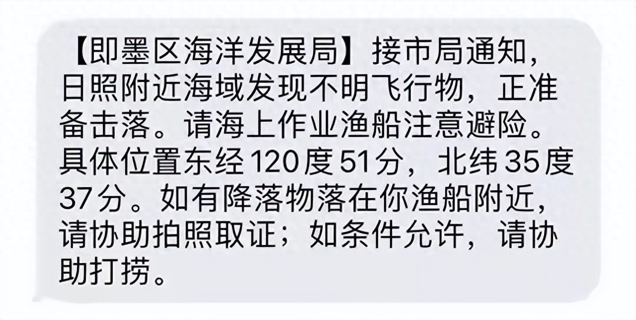 昨天下午,山东日照、即墨上空发现不明飞行物,网传山东青岛即墨区海洋发展局发消息通知称,日照附近海域发现不明飞行物,正准备击落,要求海上渔船注意避险,如有降落物在你渔船附近,请协助拍照取证;如果条件允许,请协助打捞。