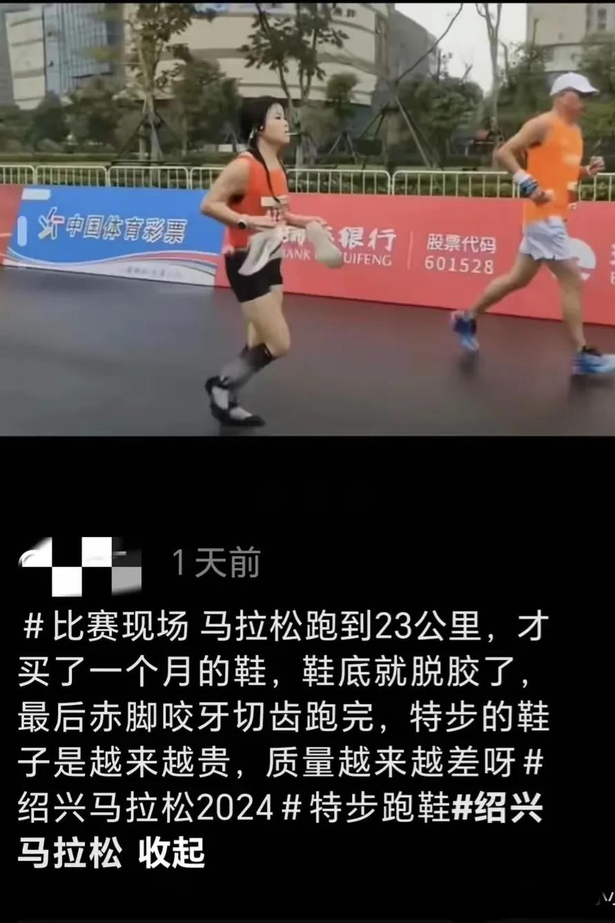 在2024绍兴马拉松的激烈角逐中,一位女选手遭遇了意想不到的挑战。她的特步跑鞋,在赛事进行至23公里时突然底部脱胶,这一变故无疑给她的比赛增添了巨大的困难。