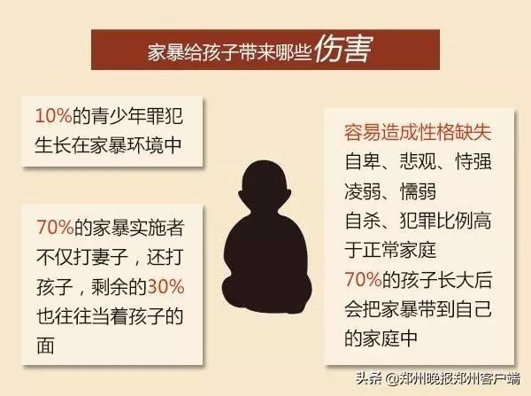 中国台湾地区的一项研究数据显示,从小目睹母亲忍受家暴的女性,长大后同时成为家暴受害者的比例,是一般女性的4.3倍;而曾经目睹家暴的男孩,长大后对伴侣施暴的概率,则比一般男性高出5.27倍。