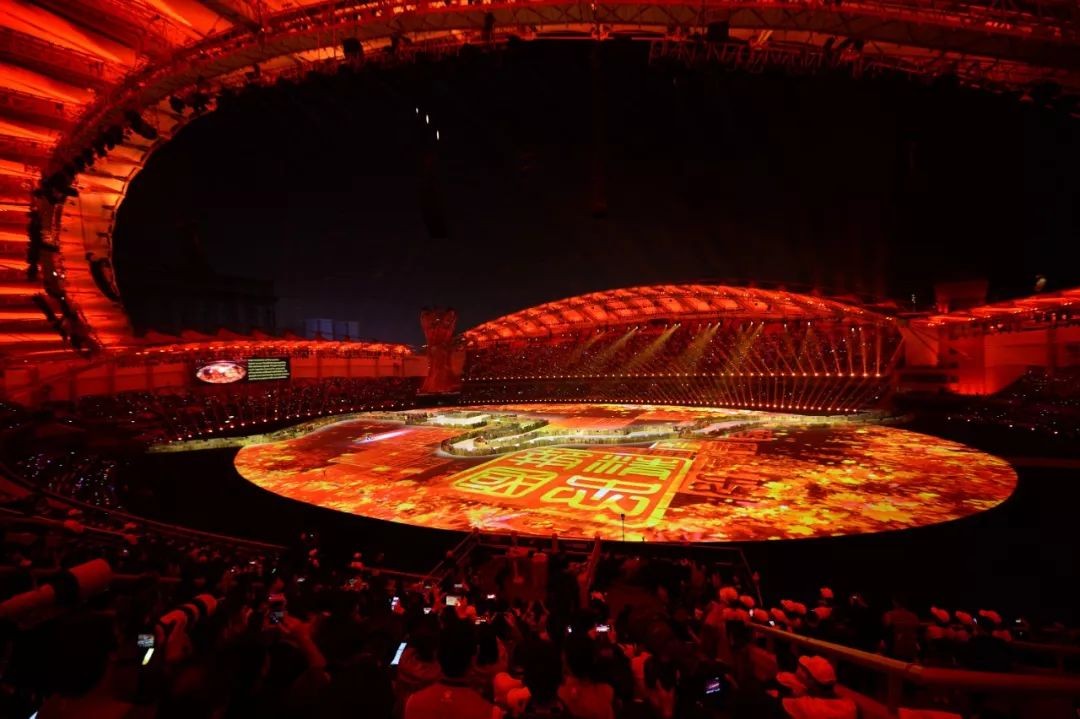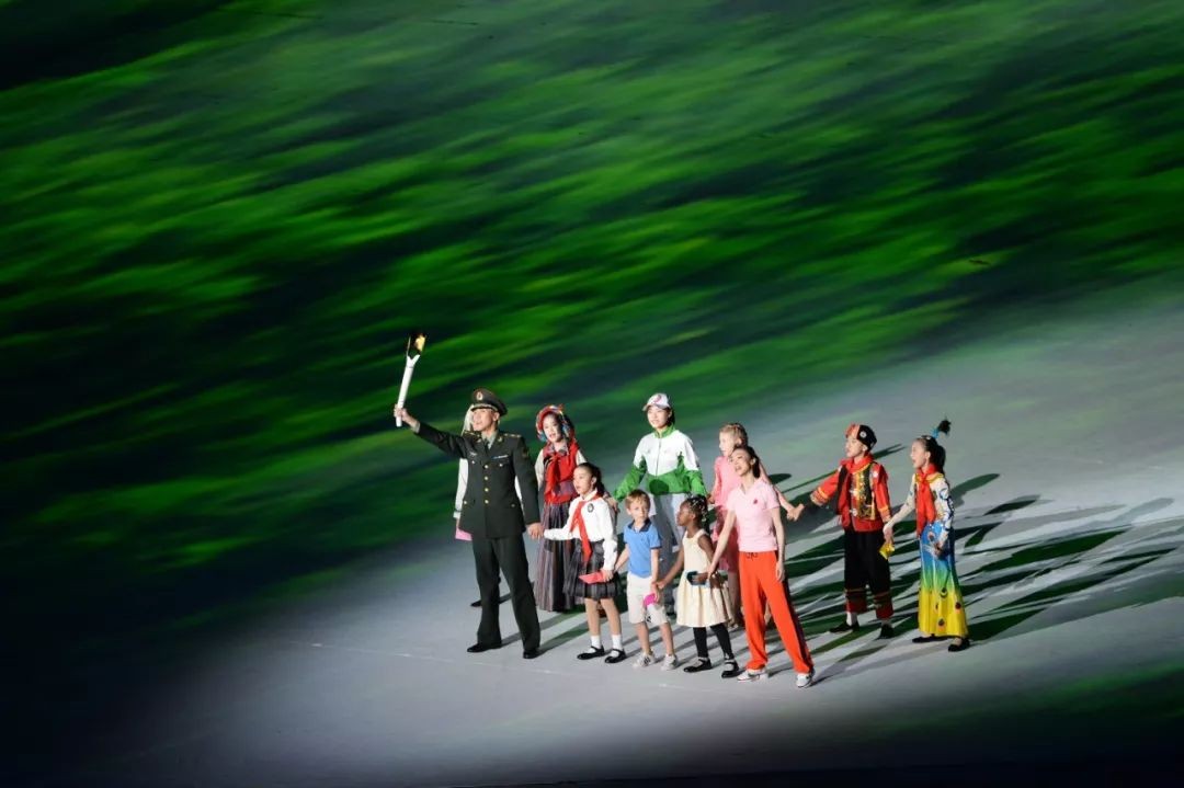 在观众欢呼声中,中华人民共和国国旗入场,紧随其后的是军运会会旗,护送国旗和会旗的各有8位旗手