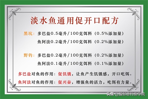 综上所述,就是冬钓鲫鱼的四大核心要点,钓鱼人如果能够将其融会贯通,灵活运用,就能取得较好的垂钓效果。不管用哪种窝料,钓鱼小药也是必不可少的,尤其是强效促食类的钓鱼小药,比如馥郁香多巴盐和鱼阿法,一个给鱼促饥饿,一个增强鱼的活力,双管齐下,效果卓绝,具体用法用量可以参考下图配方。