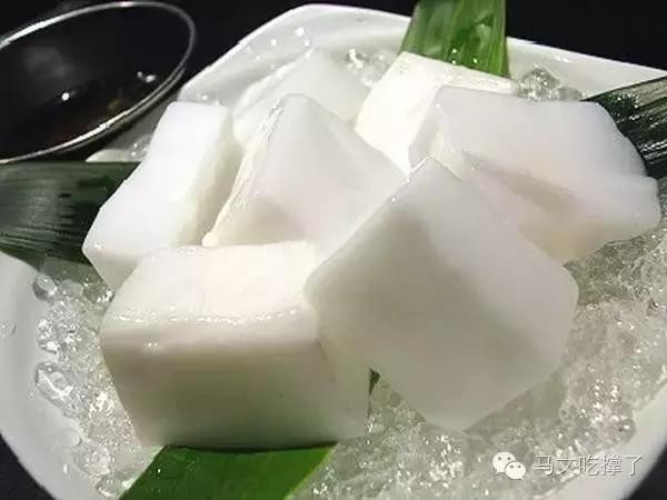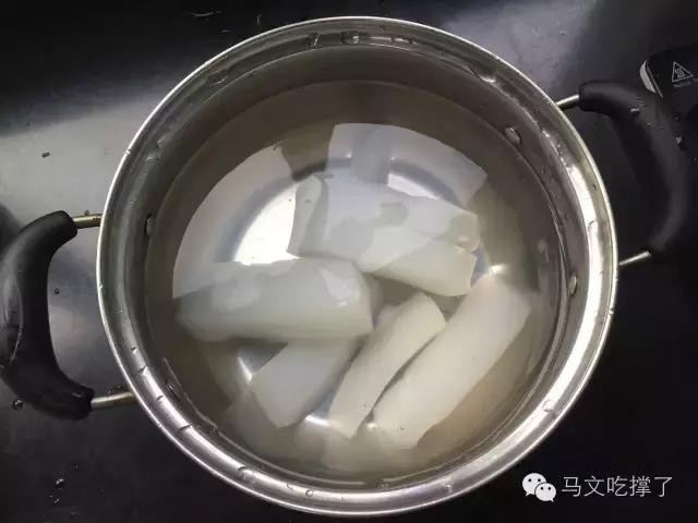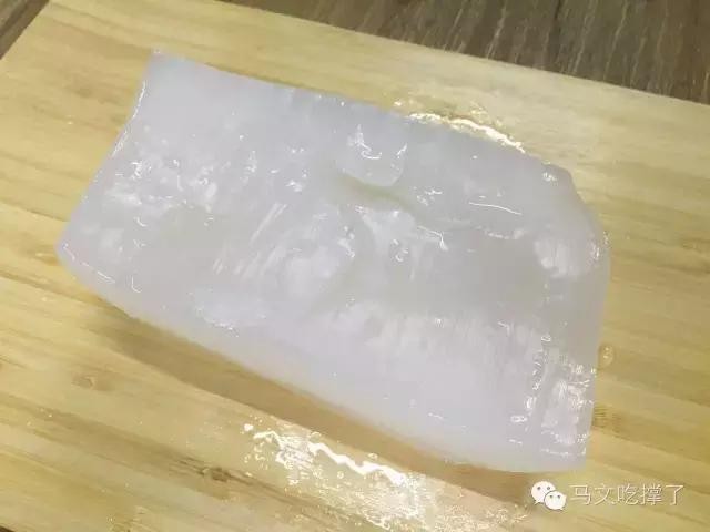 煮好的曼波鱼皮会呈现这样半透明的颜色,你可以将他切成任何你需要的形状,然后丢进冷水中冰镇一下。