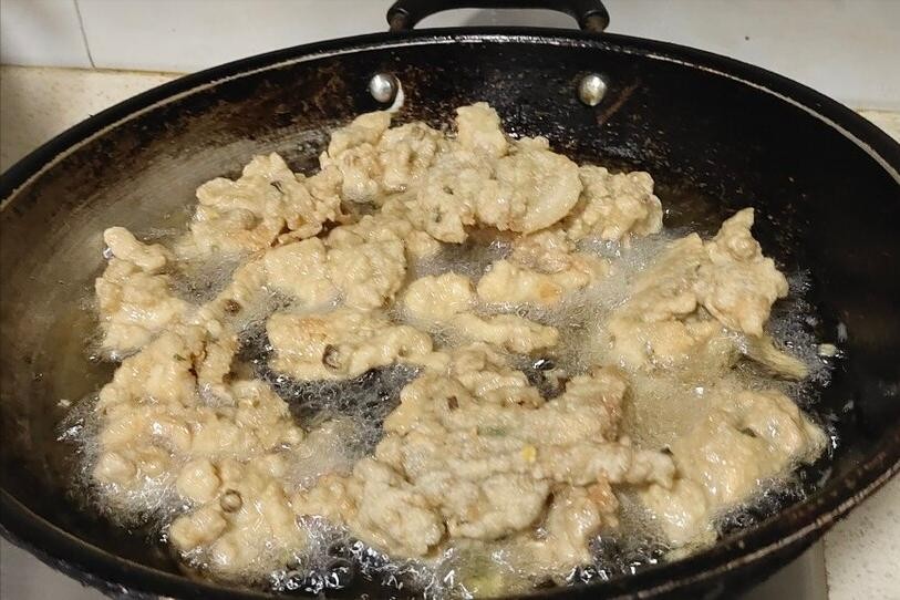 5、下面起锅烧油,等油烧热之后,我们把里脊肉一条一条放进去,用筷子搅拌一下,防止粘连在一起。小火慢炸,才能炸透、炸熟,表面微黄以后捞出来。接着升高油温,再把小酥肉倒进去复炸一次,炸到金黄色捞出来,就可以吃了。