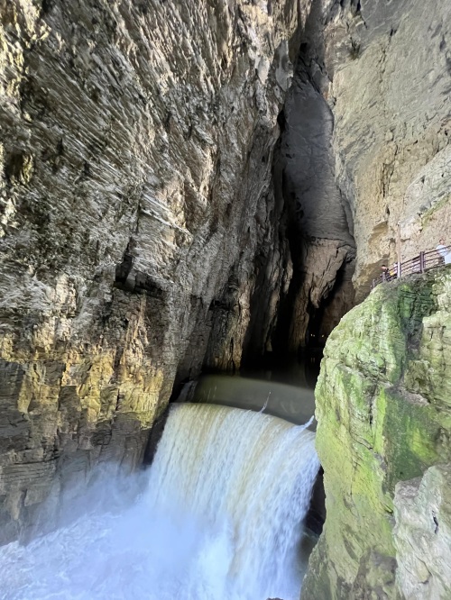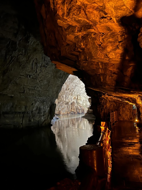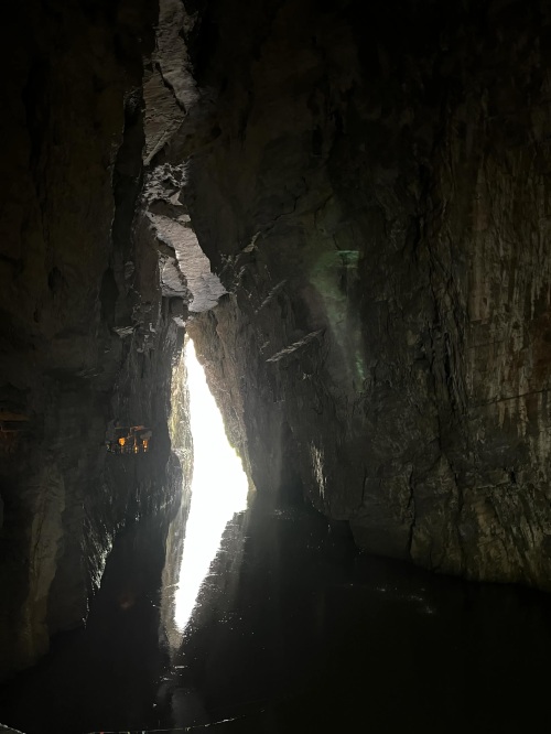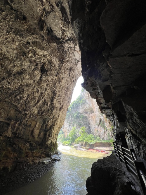 由于峡谷处于丰水期,暗河的水量增大,水流湍急,景区暂时关闭了洞内划船的项目。