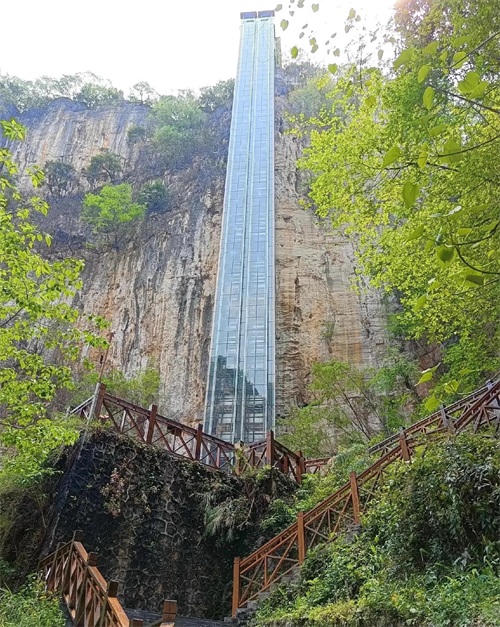 进入景区感觉游玩的人特别的少,有一种包场的感觉。据说织金大峡谷开发的比较晚,2014年的9月份才正式开放。在这里有一条西南地区最高的电梯,高达108米。居然40秒就可以到达谷底。选择乘坐电梯是因为这样观赏路线是一路下坡,会轻松很多,如果反方向游览,一路的台阶就够消耗了。网上说织金大峡谷又叫“一线三槽”,什么意思我也不太清楚,大概率应该不是吐槽三回的意思。