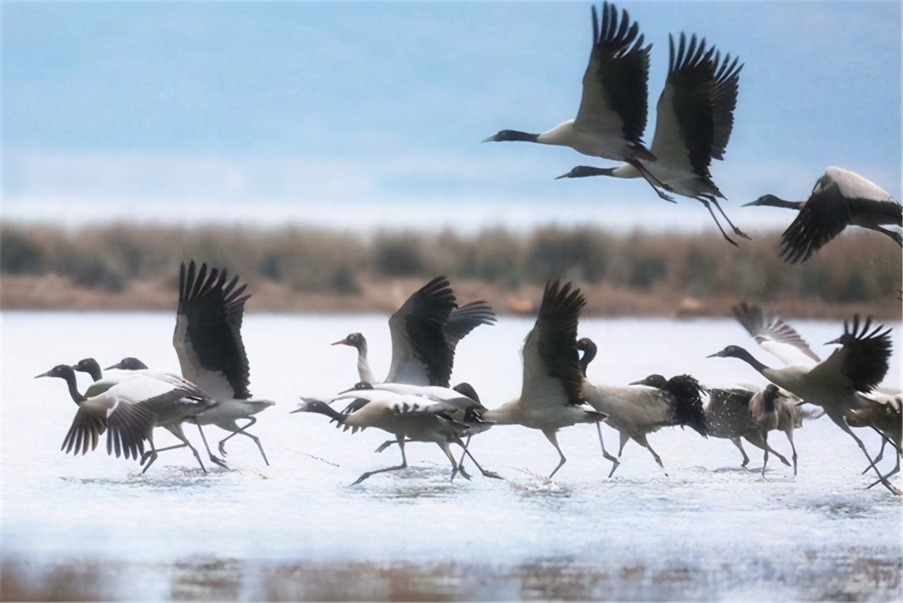 黑颈鹤是大型飞行涉禽,繁殖于拉达克,中国西藏、青海、甘肃和四川北部一带,越冬于印度东北部,中国西藏南部、贵州、云南等地。是世界上唯一生长、繁殖在高原的鹤。