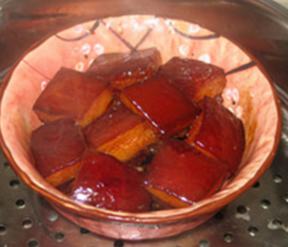 步骤三:时间到了后将锅中多余的香菜夹掉,在想肉亲亲地转移到蒸碗中,表面浇上炖肉的汤汁,然后放在蒸锅加水蒸上一个小时左右,出锅装盘即可食用。