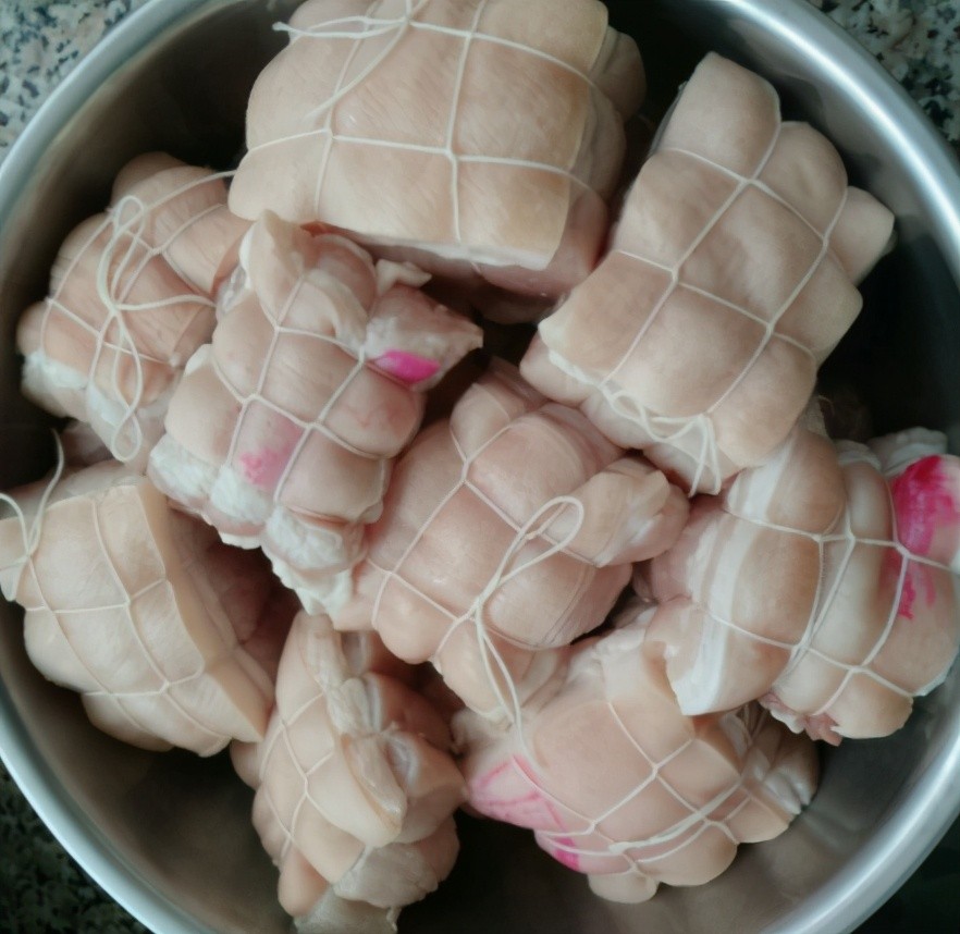 步骤一:将准备好的五花肉切成一块块,用水清洗并沥干水分,然后用线把肉扎紧。将准备好的姜切成片,葱切成段放在碗里备用。