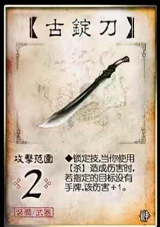 每次听到甘宁那句“你的牌太多了”,都会让人苦恼不已,这货的黑色牌全都可以都过拆来用,属实有点恶心人。所以面对甘宁时,被他换牌换到空城几乎是常态,古锭刀在他手上自然也不赖。另外,神甘宁用这把武器就更厉害了,这可是出了名的大盗,劫营已经成为无数人的噩梦,有了古锭刀他就能为所欲为。