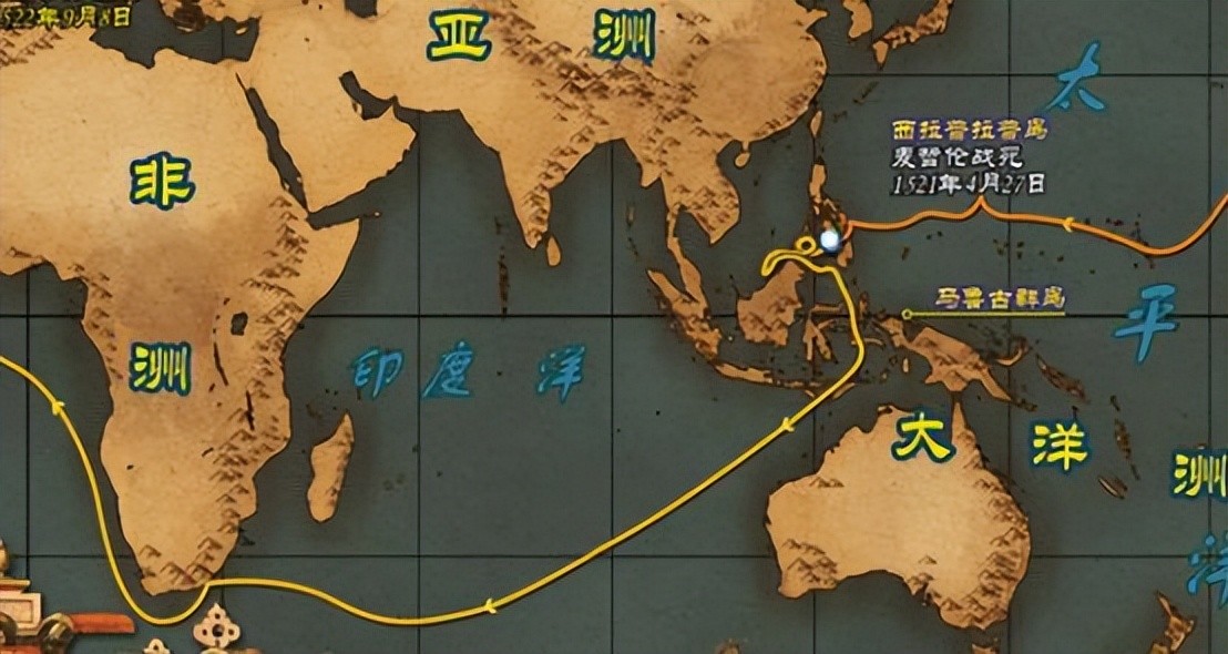 麦哲伦环球航行。1519年9月,葡萄牙人麦哲伦在西班牙国王的资助下,率领一支由五条大帆船和265名水手组成的大型探险船队出海,在向西到达美洲大陆后,沿着美洲东海岸南下,发现了美洲南部的海峡,后来人们把这里称为“麦哲伦海峡”。然后横渡太平洋,历经两年的磨难,终于到达了菲律宾群岛。麦哲伦的船队在菲律宾得到了补充,但在干涉岛上内部战争时,麦哲伦被当地的土著人杀死,他的船队进入印度洋继续向西航行,于1522年9月返回西班牙,环球航行完成,地圆学说得到了确认。
