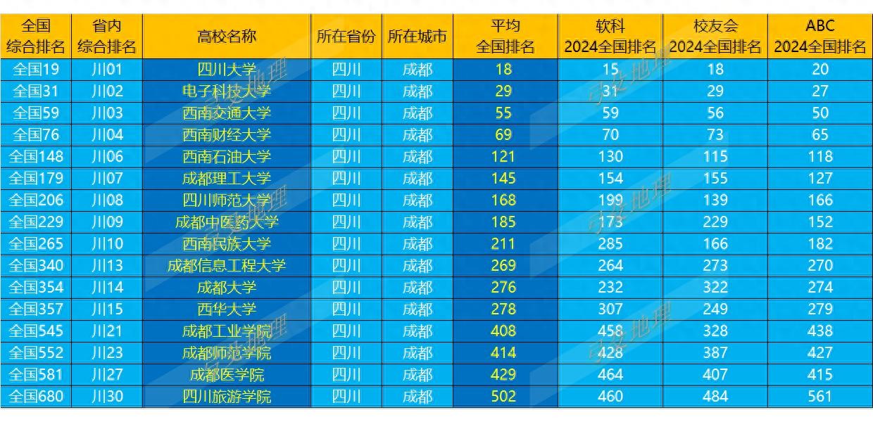 根据2024年软科、校友会、ABC分别发布的中国高校排行榜的数据,整理成都市16所本科高校的综合排名如下:
