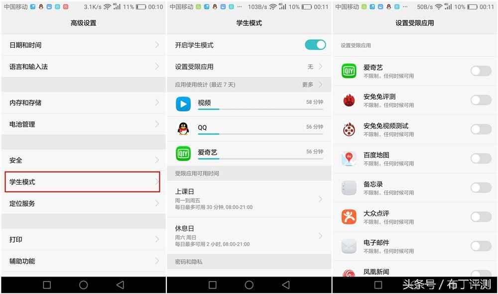 系统中还有个专门的“学生模式”,这个对于家中的熊孩子们还是很有用处的,可以直接通过设置界面中的“高级设置”选项开启,开启之后就可以进行“设置受限应用”和“受限应有可用时间”,到了设定时间之后,应用就会别锁定无法使用。
