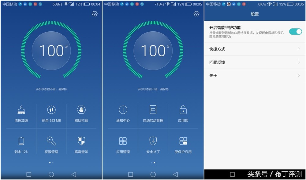 手机中还有一个专门“手机管家”功能,可以进行一键优化、清理加速、流量控制骚扰拦截、省电管理、权限管理、病毒查杀、通知中心、自动启动管理、应用锁、应用管理、安全补丁和受保护应用共12项功能,功能还是很全面的,基本上不需要第三方的手机安全应用,也可以对手机起到保护作用。