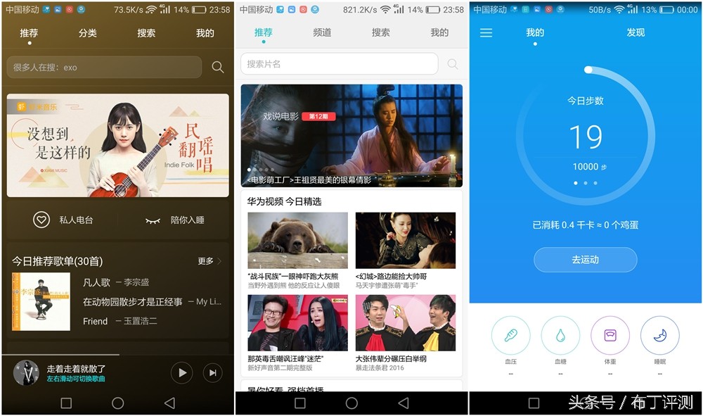系统自带音乐播放器和视频播放器,不仅支持本地播放,而且还支持在线播放,其中的在线音乐资源来自于虾米音乐,在线视频资源大多来自于优酷视频,资源还是比较丰富的。手机中还内置了“运动健康”功能,可以将手机变身为计步器,记录我们日常生活在中的运动量,当然运动的时候必须要带着手机。