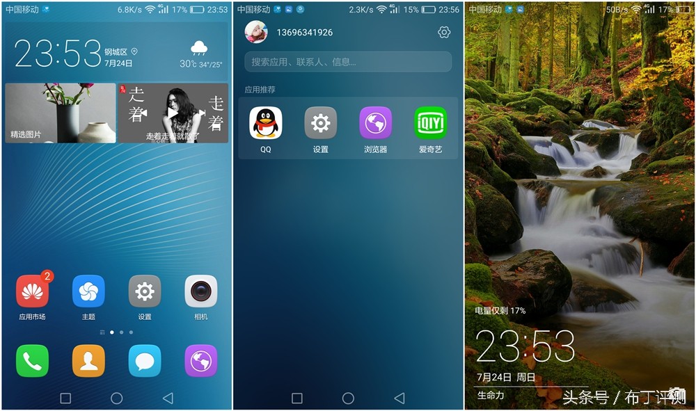 华为G9青春版系统图标都经过了圆润话处理,主界面上方是图片和音乐播放器两个模块,而且还有个专门的账号中心界面。默认的锁屏界面依旧是杂志锁屏,每次解锁都会是不同的锁屏壁纸,锁屏界面右下角是个相机快捷图标。