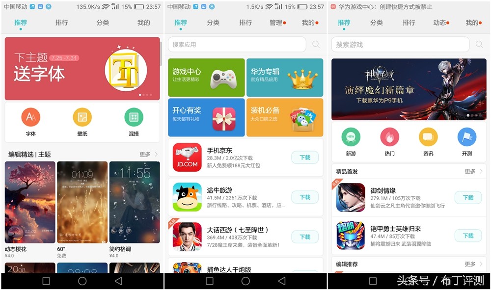 系统内置主题、应用市场和游戏中心,我们可以通过主题来进行字体、壁纸和主题的下载操作,通过应用商店和游戏中心来进行应用和游戏的下载,其中的应用资源还算比较丰富,不过游戏资源的更新速度好像要稍微慢些,一些最新的单机游戏无法搜索到。