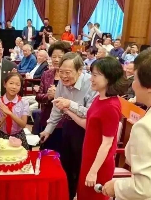 翁帆陪着杨振宁先生一起切生日蛋糕,只见杨振宁先生满脸笑意,一只手紧握着妻子,夫妻间的情谊让人备受感动。