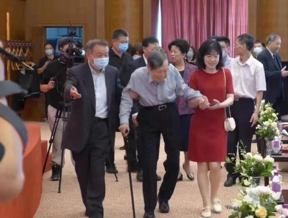 已过百岁的杨振宁,走路时已经无法完全直起腰部,由妻子翁帆一路搀扶入场,夫妻俩在这个特别的日子里高调同框。当时翁帆身穿红色气质款连衣裙,背着白色包包,举手投足间尽显优雅。