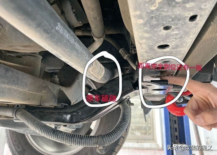 1换改装前避震器粗于原车避震器,所以平衡杆运动时磕避震器弹簧,